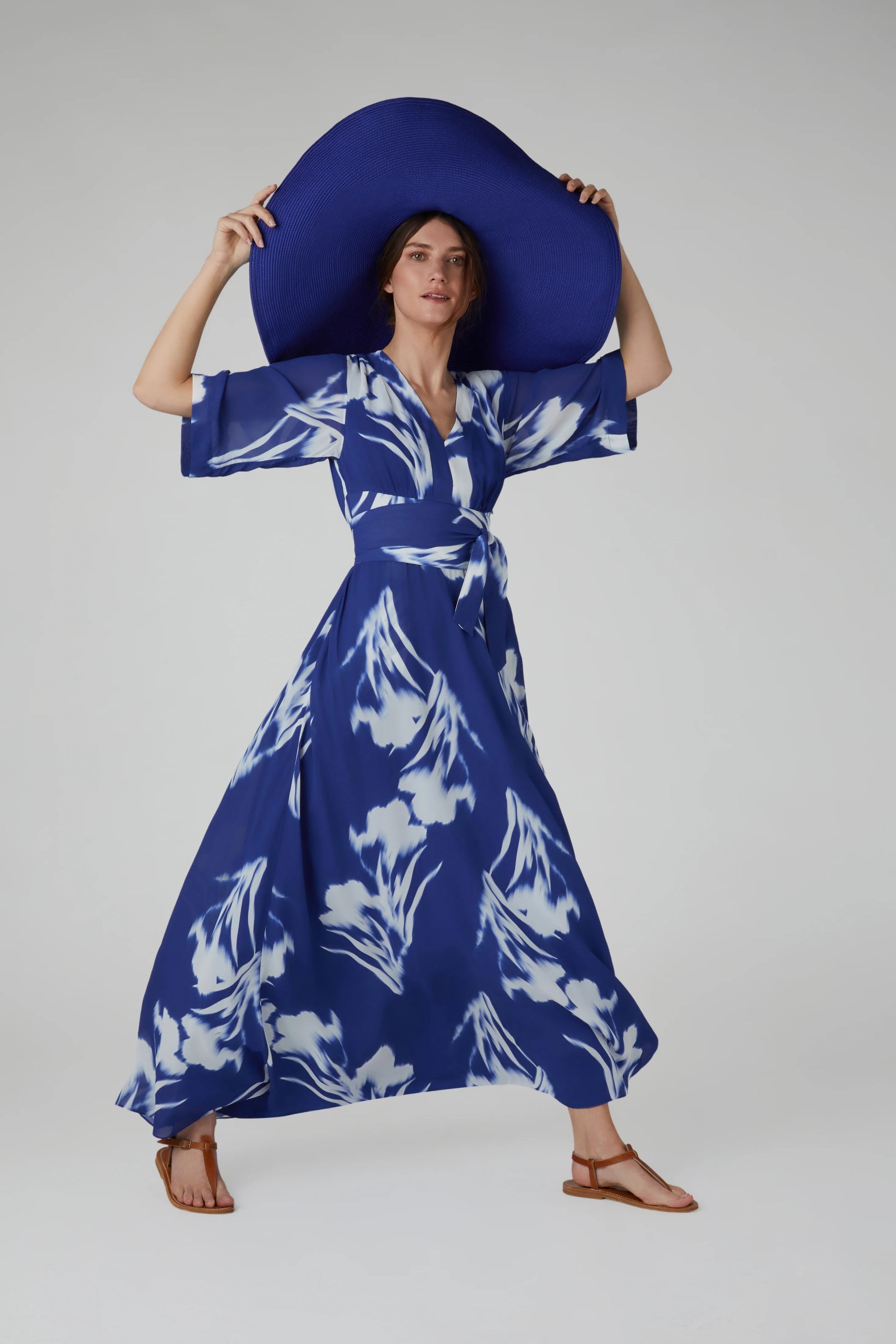 Jasper Conran "Ira" Printed Georgette Maxi V Neck Dress in Blue